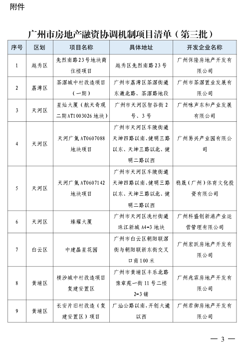 根据住房城乡建设部、金融监管总局《关于建立城市房地产融资协调机制的通知》(建房〔2024〕2号)要求,为一视同仁满足不同所有制房地产企业合理融资需求,精准支持房地产项目建设交付,经企业申请、各区核查,并报市房地产融资协调工作小组同意,形成了广州市房地产融资协调机制项目清单(第三批,排名不分先后),现推送给你们。