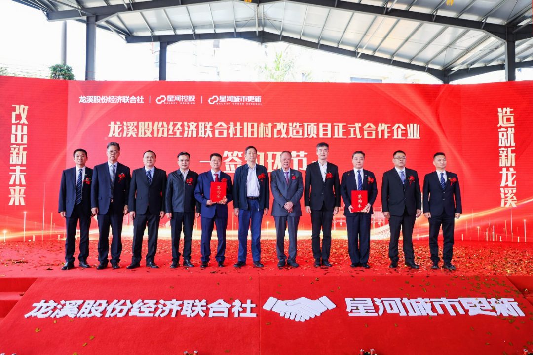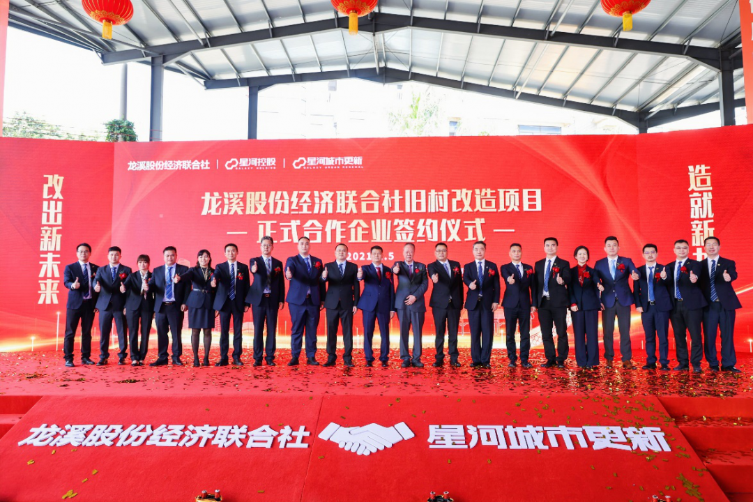2月5日上午,广州市荔湾区海龙街龙溪股份经济联合社旧村改造项目正式合作企业签约仪式在龙溪村隆重举行。荔湾区委常委方武明,区委常委、区政府常务副区长林隽及区各职能部门领导,海龙街道党工委书记叶辉、海龙街道办事处主任何人生等领导班子、龙溪经济联社党委会书记、联社理事长陈锦文、联社领导班子、星河控股集团董事长黄楚龙、星河控股集团董事副总裁时锋、星河华南城市更新集团总裁岳天飞及星河华南城市更新集团常务副总裁张宏等领导,龙溪村党员、股东代表等共同参加了本次仪式。